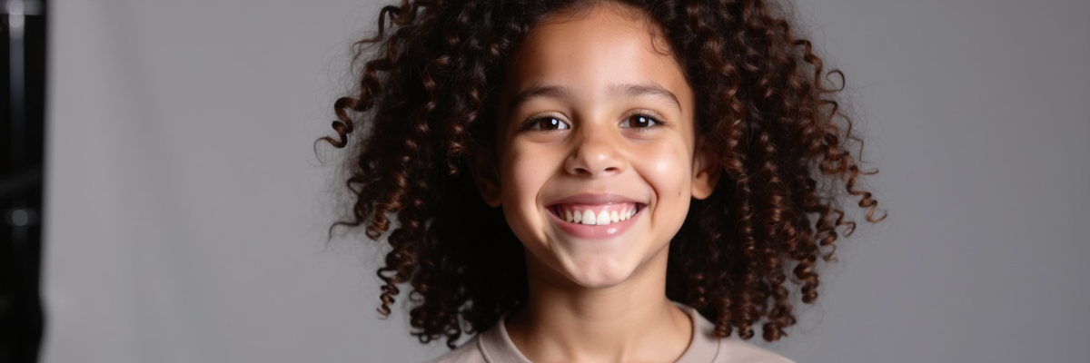 EBONY : Petite fille métisse, cheveux crépus ou très frisés. Âge : 6 à 9 ans. Sourire espiègle, énergie vive et expressive.